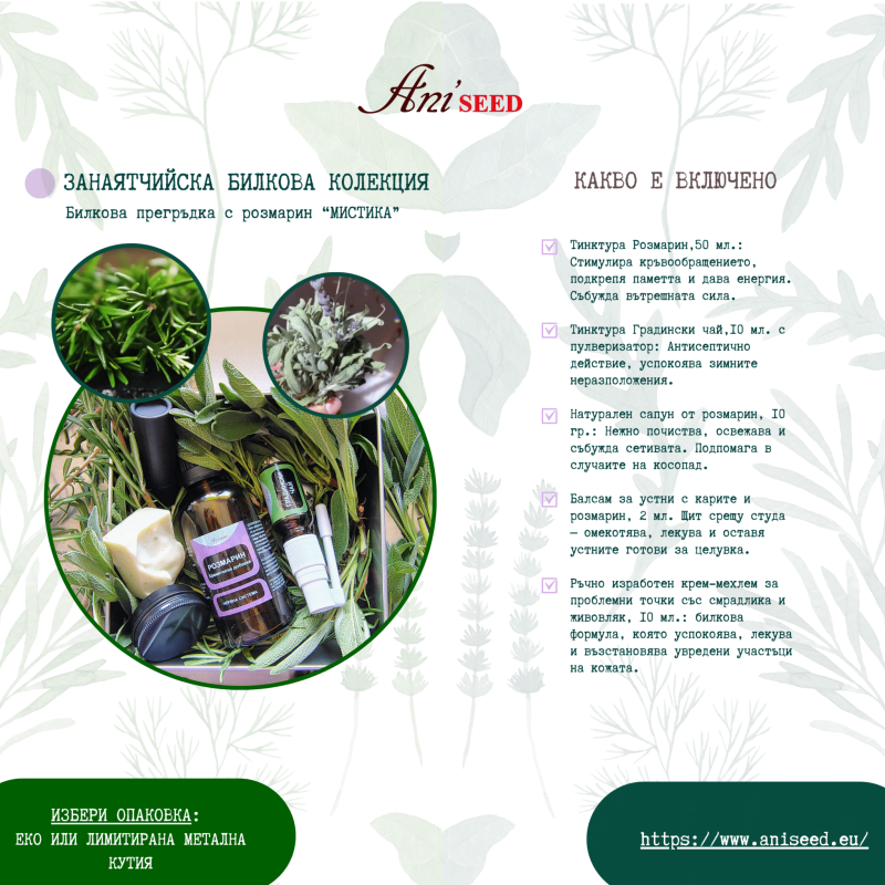 Занаятчийска билкова колекция „Билкова прегръдка с розмарин – Мистика“ в еко кутия с размери 150х150мм