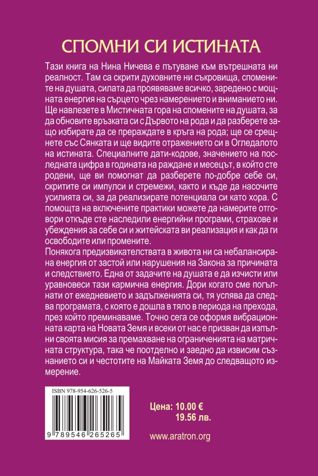 Тази книга на Нина Ничева е пътуване към вътрешната ни реалност. Там са скрити духовните ни съкровища, спомените на душата, силата да проявяваме всичко, заредено с мощната енергия на сърцето чрез намерението и вниманието ни. Ще навлезете в Мистичната гора на спомените на душата, за да обновите връзката си с Дървото на рода и да разберете защо избирате да се прераждате в кръга на рода; ще се срещнете със Сянката и ще видите отражението си в Огледалото на истината. Специалните дати-кодове, значението на последната цифра в годината на раждане и месецът, в който сте родени, ще ви помогнат да разберете по-добре себе си, скритите си импулси и стремежи, както и къде да насочите усилията си, за да реализирате потенциала си като хора. С помощта на включените практики можете да намерите отговори откъде сте наследили енергийни програми, страхове и убеждения за себе си и житейската ви реализация и как да ги освободите или промените.