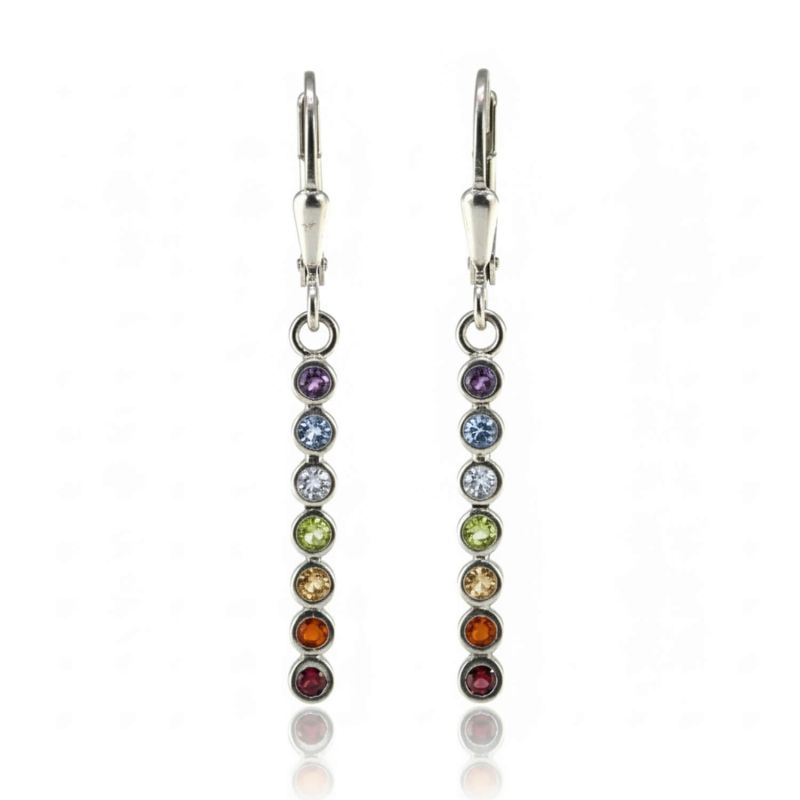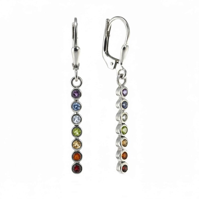 Тези зашеметяващи обеци с чакра камъни ви зареждат с правилната енергия по всяко време. По един камък представлява всяка от седемте основни чакри: гранат (коренна чакра), карнеол (сакрална чакра), цитрин (чакра на слънчевия сплит), перидот (сърдечна чакра), син топаз (гърлена чакра), йолит (чакра на третото око) и аметист (коронна чакра). Камъните са инкрустирани в сребро проба 925, което се предлага и в позлатен вариант.