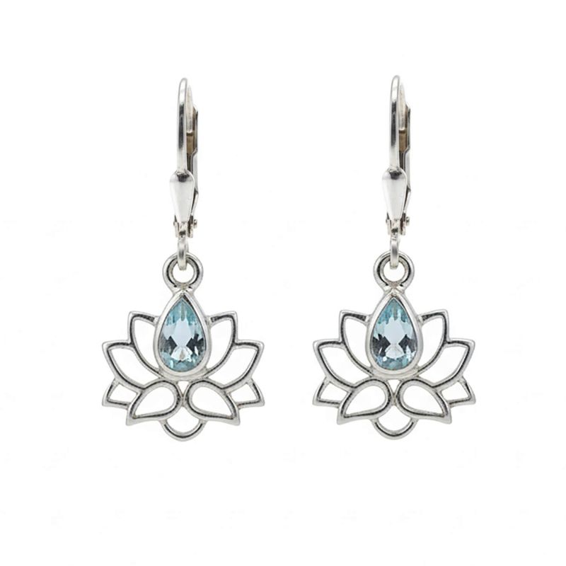 Обеци с висящ лотос и скъпоценен камък Сребърни, син топаз