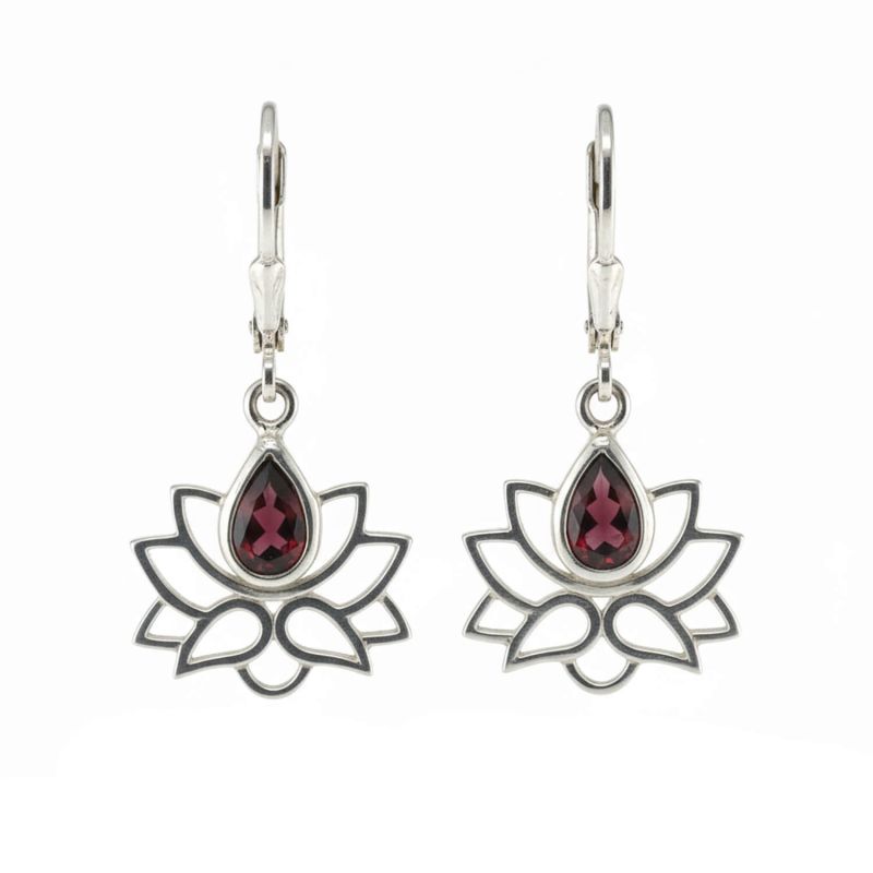 Обеци с висящ лотос и скъпоценен камък Сребърни, гранат