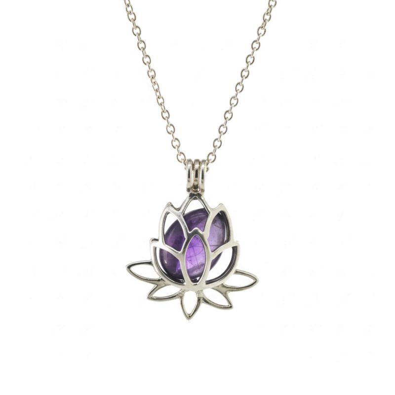 Това зашеметяващо бижу за йога добавя нотка духовна елегантност към всяко облекло. Цветето лотос служи като взаимозаменяема висулка, което ви позволява да изберете камък въз основа на вашето настроение или намерение. Изберете между аметист (спокойствие, яснота), розов кварц (любов, приятелство) и черен турмалин (защита). Висулката може лесно да се отвори, за да смените камъка.