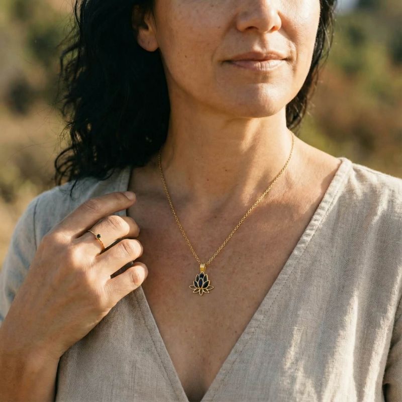 Това зашеметяващо бижу за йога добавя нотка духовна елегантност към всяко облекло. Цветето лотос служи като взаимозаменяема висулка, което ви позволява да изберете камък възоснова на вашето настроение или намерение. Изберете между аметист (спокойствие, яснота), розов кварц (любов, приятелство) и черен турмалин (защита). Висулката може лесно да се отвори, за да смените камъка.