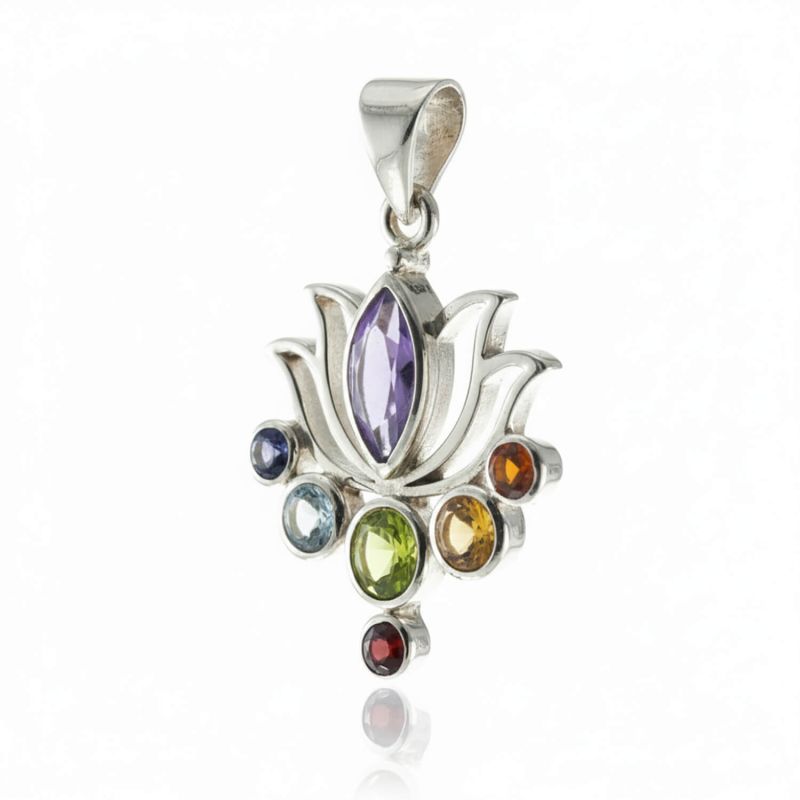 Лотосовият цвят символизира чистота, обновление и духовно пробуждане, докато седемте чакри представляват нашите вътрешни енергийни центрове. В това уникално бижу и двата символа се обединяват в перфектна хармония: медальонът с лотос и чакра камъни ви помага да балансирате тялото, ума и духа.