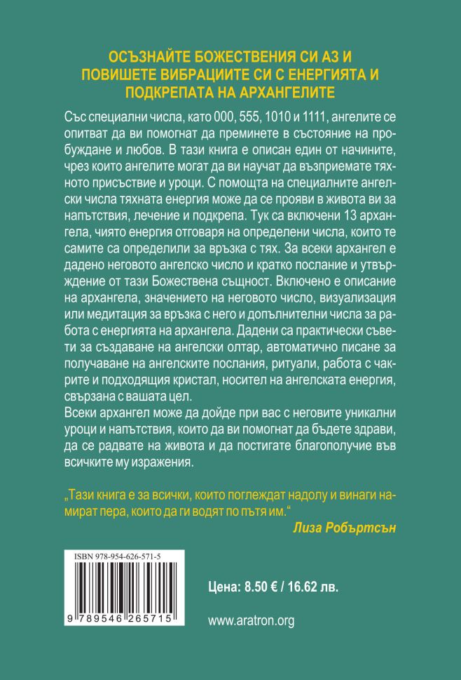 Със специални числа, като 000, 555, 1010 и 1111, ангелите се опитват да ви помогнат да преминете в състояние на пробуждане и любов. В тази книга е описан един от начините, чрез които ангелите могат да ви научат да възприемате тяхното присъствие и уроци. С помощта на специалните ангелски числа тяхната енергия може да се прояви в живота ви за напътствия, лечение и подкрепа. Тук са включени 13 архангела, чиято енергия отговаря на определени числа, които те самите са определили за връзка с тях. За всеки архангел е дадено неговото ангелско число и кратко послание и утвърждение от тази Божествена същност. Включено е описание на архангела, значението на неговото число, визуализация или медитация за връзка с него и допълнителни числа за работа с енергията на архангела. Дадени са практически съвети за създаване на ангелски олтар, автоматично писане за получаване на ангелските послания, ритуали, работа с чакрите и подходящия кристал, носител на ангелската енергия, свързана с вашата цел.