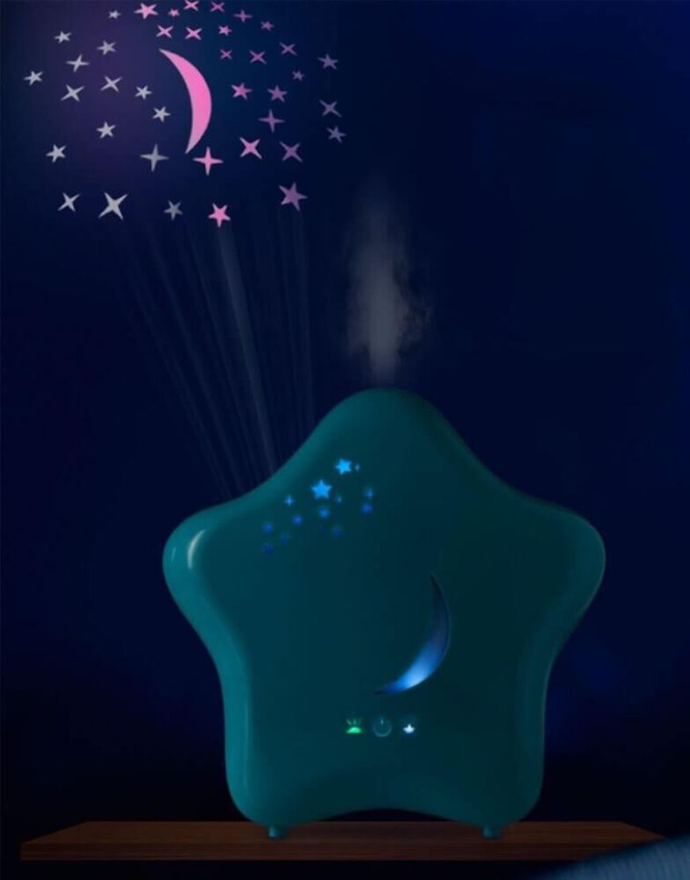 Така че, чрез овлажняване на въздуха, MOONY трансформира стаята на бебето в здравословна и успокояваща среда преди лягане. Той също така разпръсква етерични масла, действа като успокояваща нощна светлина с нежна бяла светлина и завладява детето с проекцията на луната и цветните звезди върху тавана. Тези функции могат да се използват отделно, когато имате нужда от тях.
